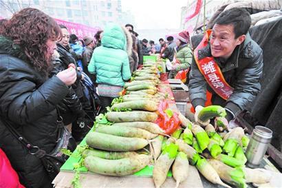 ????“來,隨便挑隨便揀,我現場給你削皮切片,有一點糠瓤,我立馬賠你100元錢?!币幻砼t色綬帶的蘿卜攤販邊推介自己的蘿卜“清脆爽口”,邊為顧客現場削皮切蘿卜(左圖)。這名攤主胸有成竹地告訴記者,他帶來的蘿卜是正宗的濰縣蘿卜,因此對質量絕對“有把握”。為展示自己蘿卜的品質與眾不同,他現場免費為買了蘿卜的市民“來料加工”,削皮、切片、切條……方便市民現場品嘗的同時,也讓這些顧客成為自己的活廣告。