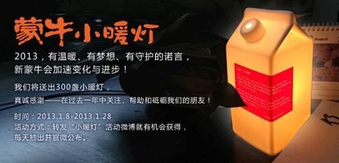 除了線下的行動,蒙牛在線上的溫暖關懷也一直在進行。春節前夕,蒙牛乳業官方微博發起的“小暖燈”活動,將2012年的感動瞬間集合到一起,令人動容;蒙牛乳業官方發起的“點滴幸福,此刻最濃”春節回家活動,讓網友在參與的同時,感受到了家的溫暖。