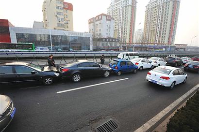 昨晨7時30分許,一輛紅色標致轎車沿福州北路向南剛駛上膠寧高架路入口,為避免地面凝霜司機踩下剎車減速,就在此時,身后突然傳來“砰砰砰”數聲巨響,紅色標致轎車也猛地晃動了一下——至少八輛車在路邊發生連環追尾事故,所幸無人受傷。“以前福州北路都開得挺慢,這幾天車少,速度都快起來了。 ”一輛追尾車輛的司機推測道。