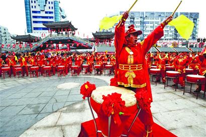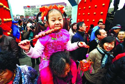 上午10時28分,海云廣場鑼鼓震天,百人組成的威風鑼鼓隊用手中的鑼鼓啟動海云庵糖球會開街儀式。今年的糖球會開街儀式沒有明星大腕,也沒有舞臺演出,簡短的開街儀式過后,社區居民巡游方隊進入會場,與現場趕會市民舞動起來。首先進場的是貨郎巡游方隊,裝扮成老貨郎的居民挑著貨挑子、扛著糖球草靶子,嘴里吆喝著“賣糖球來”走進會場,讓市民感受老青島貨郎在街頭做買賣的場景。隨后出現的是高蹺巡游隊和秧歌隊。社區大媽們揮舞著腰間的紅綢,和趕會市民一起扭著大秧歌。此時,海云廣場北側的糖球會城門緩緩打開,趕會市民和巡游隊伍一同進城趕會。