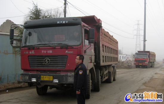 ????今天上午,島城被大霧籠罩,能見度不足二十米。為了保證安全,李滄城管湘潭路中隊早上6點開始例行檢查。在南嶺一路,一輛大貨車被執法人員截住,不一會又陸繼來了三輛。經了解,這些渣土運輸車全是給重慶路施工運輸渣土的,但是都屬無建筑運輸許可證的非法運輸車輛。