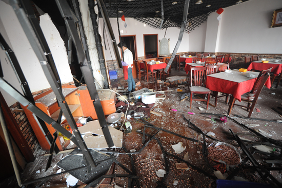事故發生在安陽路一處名為宜家川菜的小飯店,記者趕到現場時,只見整座飯店已經被炸得面目全非,前門臉墻體被崩開,塑鋼門窗也被炸掉。店里的桌椅以及啤酒瓶、啤酒箱都被崩了出來,門口地面上遍布碎玻璃。