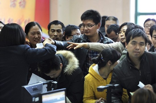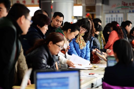 3月4日,濟南,“國五條”細則落地的首個工作日,在房產交易中心,人頭攢動。工作人員現場發號,疏導辦理房產交易相關手續的人群(游暢)