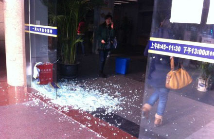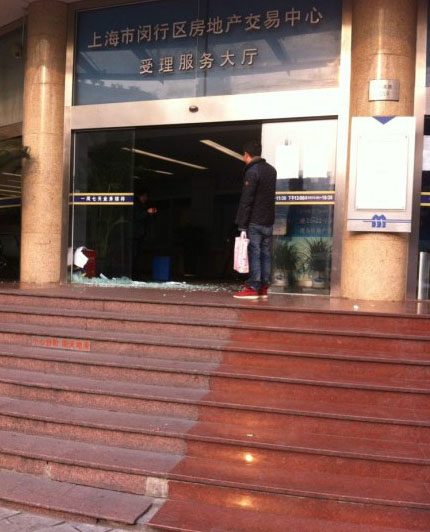 3月5日8點,上海閔行房產交易中心玻璃門被擠碎。
