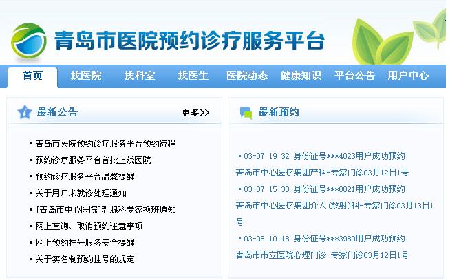 網上掛號平臺首批上線的6家試點醫院分別是青島大學醫學院附屬醫院、青島市市立醫院(東西兩院)、青島市海慈醫療集團、青島市中心醫院、青島市婦女兒童醫院及青島市城陽區人民醫院。