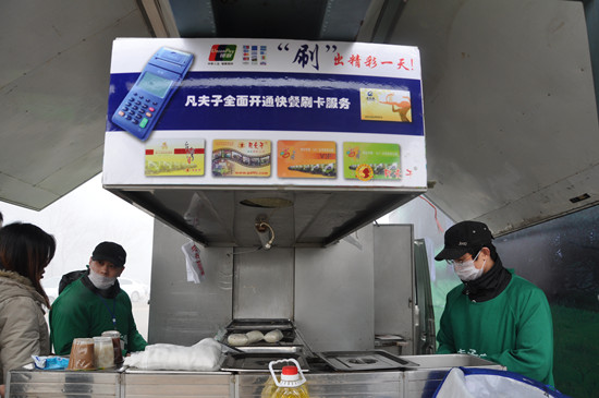 ??? 青島新聞網3月8 日訊 自今天起,持島通卡可以購買“凡夫子”早餐了!目前,我市60余輛凡夫子行動快餐車已安裝好琴島通刷卡設備,市民可以刷琴島通卡購買早餐,只需在pos機上刷一下即可完成付款,既便利又快捷,不但不用準備零錢、節省了時間,還能防止食物跟錢款接觸,保障了食品的安全衛生。