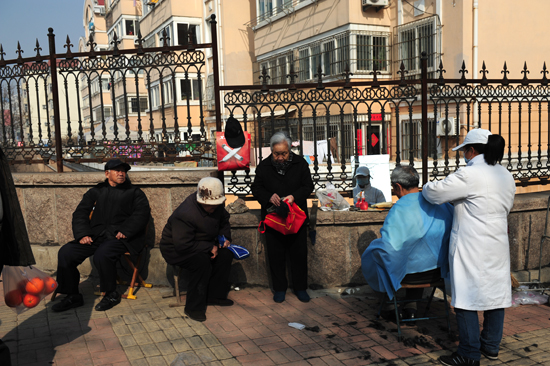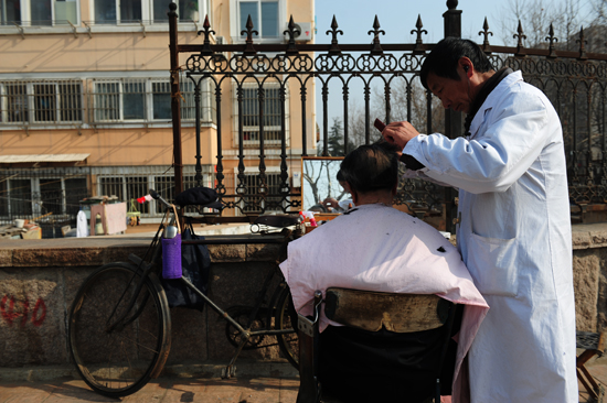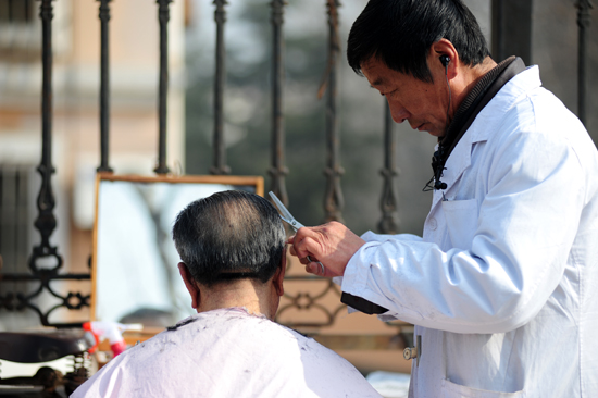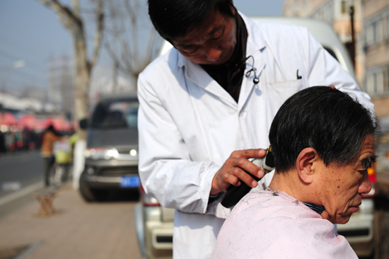 簡單的工具寒酸的行頭與現(xiàn)在裝修豪華的理發(fā)店相比寒磣不少,可仍然吸引了無數(shù)老年人前來。張力偉 攝