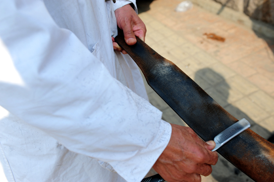 現(xiàn)在這種剃刀已經(jīng)很少有人會(huì)用了,沒個(gè)幾十年的手藝很容易傷人。張力偉 攝