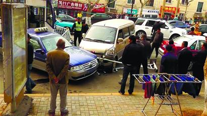 ????“人民路上一輛面包車沖向了逆行道,一下子撞了兩輛車,現在人民路上亂成一鍋粥了。”昨天下午3時40分左右,市民趙先生撥打早報熱線82888000報料說。記者接到線索后迅速趕到事故現場,看到一輛黑色三菱轎車車頭受損變形,一輛面包車的車尾被撞凹陷,面包車的車頭撞翻了一段十幾米長的護欄,并且夾著一段護欄撞上了逆行道上的一輛出租車,出租車尾部被直接頂到了一輛公交車上,公交車的車頭受損。除了這4輛車外,被撞壞的護欄還砸上了一輛等候信號的出租車。