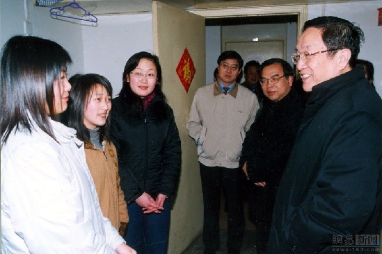 2005年5月16日發,湖北省委書記俞正聲在武漢大學學生宿舍與學生談心。新華社/閩一帆(資料照片)