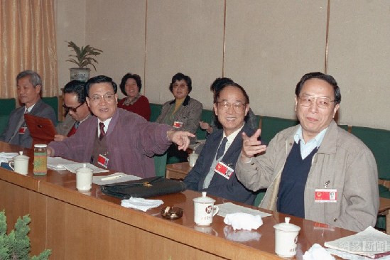 1993年7月1日發,山東省省長趙志浩(右三)、青島市市委書記俞正聲(右一)在人大山東省代表團小組會上。新華社/王新慶