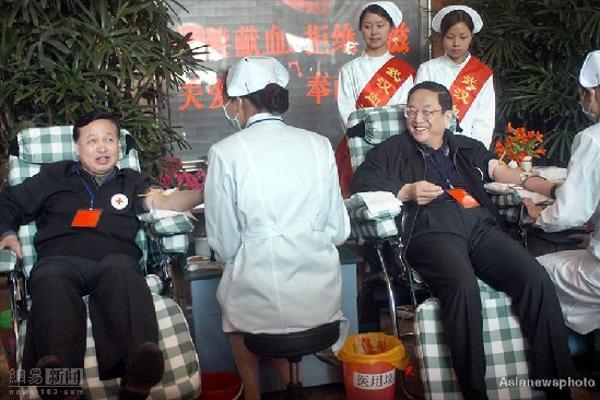 2004年4月1日上午,武漢市,俞正聲、羅清泉等湖北省領導作為普通獻血者伸出了臂膀。與他們一起參加無償獻血的,還有200多名省直機關工作人員、大學生等熱心人士。中國日報供圖胡偉鳴胡義華/攝