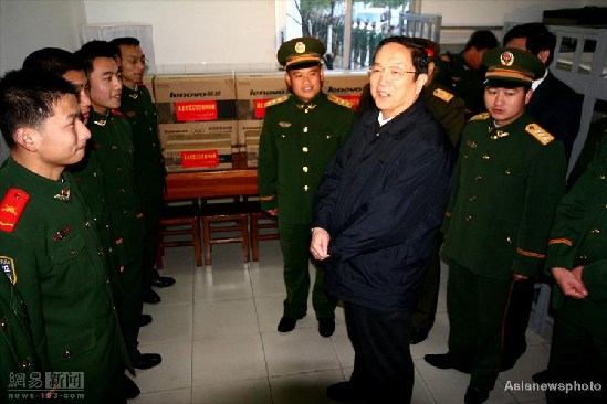 2007年2月8日上午,中共中央政治局委員、湖北省委書記俞正聲率省雙擁慰問團深入武警總隊基層單位,看望廣大官兵,祝愿大家春節快樂、身體健康,在新的一年里生活更加富足。中國日報供圖彭文/攝
