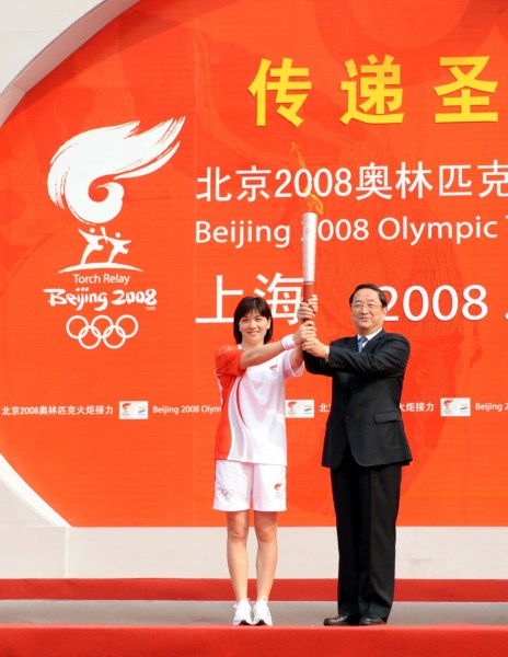 2008年5月23日,中共中央政治局委員、上海市委書記俞正聲(右)與上海第一棒火炬手莊泳共同展示火炬。當日,北京奧運會圣火在上海傳遞。新華社/劉力航