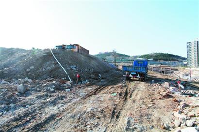 在一條通往施工現場的道路上,記者在現場觀察了兩個小時,沒有一輛大貨車通行。期間,只有一輛藍色小貨車駛過,將鉆孔機、電焊設備、鐵鏟、鋤頭等施工工具運入場地內。