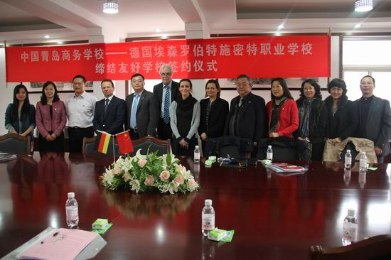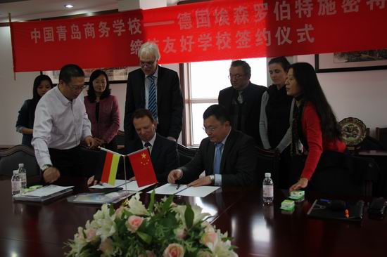 ????在簽約儀式上,商務(wù)學(xué)校校長孫信成和德國埃森羅伯特施密特職業(yè)學(xué)校校長代表Herbert Weitk?mper(維特坎貝爾)分別致辭,雙方學(xué)校都表示對今后的合作與交流充滿信心。教育局職成處領(lǐng)導(dǎo)向中德兩所學(xué)校正式建立友好合作關(guān)系表示了熱烈的祝賀,對雙方學(xué)校前期工作予以充分肯定,真誠希望青島商務(wù)學(xué)校和埃森市羅伯特施密特職業(yè)學(xué)校的教育交流日益密切,合作成果層出不窮。