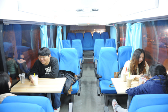 青島新聞網(wǎng)3月20日訊 近日,每當(dāng)夜幕降臨,青大一路上的停車線內(nèi)總會(huì)出現(xiàn)一輛特殊的公共汽車,從遠(yuǎn)處看它和普通的大巴沒(méi)什么區(qū)別,可走進(jìn)以后卻發(fā)現(xiàn),這是一家小資餐廳。這個(gè)巴士餐廳一經(jīng)建成,立即成為一道特色風(fēng)景線,吸引了附近不少大學(xué)生前來(lái)。
