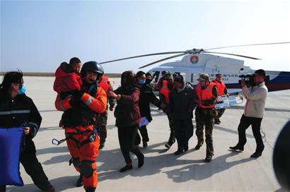 如何在吊運中確保安全將男童救上直升機呢?救生員與機組人員商議后,決定首先將男童的父親吊進直升機機艙。在對兩歲男童實施救助中救生員專用裝備包派上了用場。救生員將男童裝進救生員專用裝備包內,并不斷引導安撫男童。為避免男童在吊運過程中受到驚嚇確保安全,機組人員采用男童母親、男童和救生員三個人同時吊運的方式一次性救上直升機,平安脫離險境。隨即,直升機直飛東營機場。 9時40分,直升機在東營機場落地。 3名受困人員轉交東營機場相關部門,安全脫險。