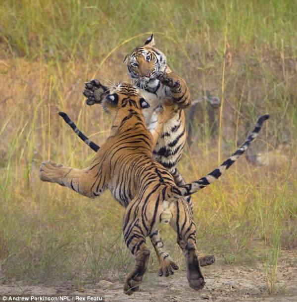 據英國《每日郵報》3月27日刊登了一組兩只幼虎打斗的精彩畫面。照片中,這兩只年幼的孟加拉虎在印度斑德哈瓦加國家公園嬉鬧大打出手,精疲力竭后躺在池邊休憩。這兩只幼虎打斗極為激烈,又撕又咬,甚至一度扭打在一塊。它們的打斗一直從地上持續到附近的水池。但它們并未因此而停止,而是在水里繼續打斗。盡管它們的打斗看似激烈,事實上它們只是通過打斗來舒展筋骨。最后,這兩只孟加拉虎打累了便并排躺在池邊休息以恢復體力。