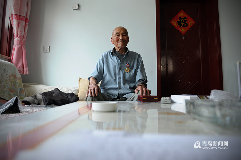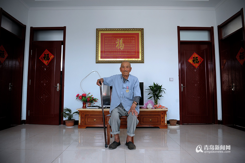 ????如今,楊老住在兒子家中安度晚年,每天散散步、曬曬太陽,生活安逸。青島新聞網(wǎng)記者采訪時(shí),楊老特意拿出社會組織為他制作的勛章,戴在身上,挺直腰桿兒,要求給他拍一張照片。(孫志文 攝)