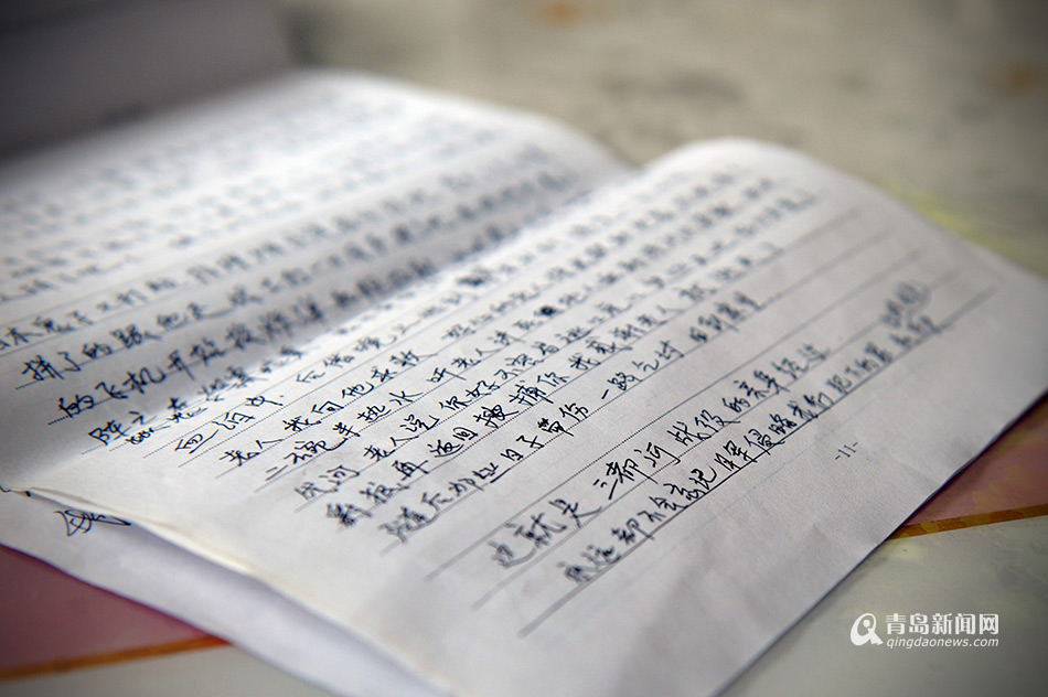????93歲的楊老耳聾眼花,說起話來也已經(jīng)口齒不清,為了讓青島新聞網(wǎng)了解他的戰(zhàn)爭故事,老人特意將自己的經(jīng)歷簡單地整理下來,寫在紙上。他寫的文字主要介紹了發(fā)生在1943年的三都河戰(zhàn)役。(孫志文 攝)