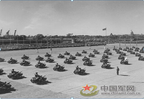 ????4、摩托化步兵方隊乘坐的并不是汽車,而是一百六十輛摩托車,煞是威風。在閱兵部隊后面壓陣的,是鼓樂齊鳴的軍樂團。