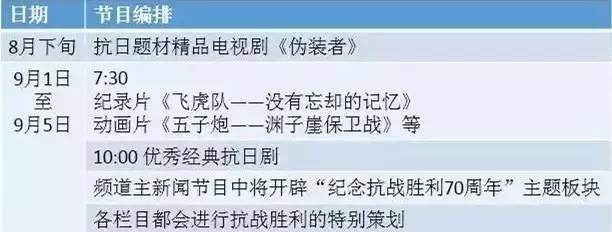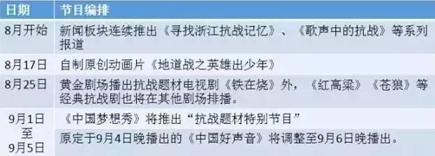 ????娛樂節目停播期間,各大衛視將用新聞、反法西斯電視劇、紀錄片、專題節目等來填補檔期,抗日題材電視劇自然不用說,從8月下旬就開始風風火火的播了。