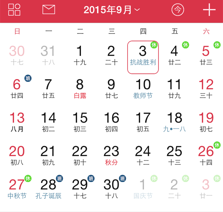 ????9月3日至5日(周四至周六)調休放假,連休3天,小長假~