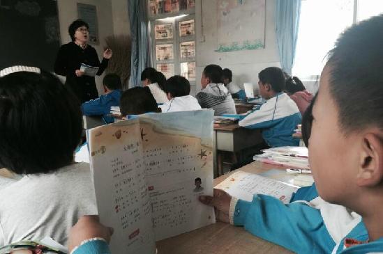 ????在松旺莊小學(xué)里,王詠梅教孩子們唱起了《大海啊,故鄉(xiāng)》,這是小學(xué)4年級(jí)音樂課本上的一首歌。孩子們抱著音樂課本跟著王詠梅一句一句地唱,歌聲嘹亮而動(dòng)聽。