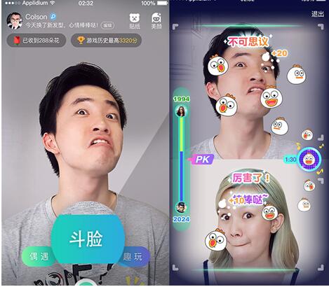 在“碰唄”隨機視頻聊天功能模塊下,易信先后創新性加入了“趣玩”和“斗臉”等游戲版塊,視頻雙方可通過成語接龍、K歌之王、表情PK等小游戲增強代入感,緩解尷尬。同時,易信在互動游戲中仍不斷強化社交元素,引導玩家從游戲回歸社交,縱向深化和加固好友間的情感鏈接。