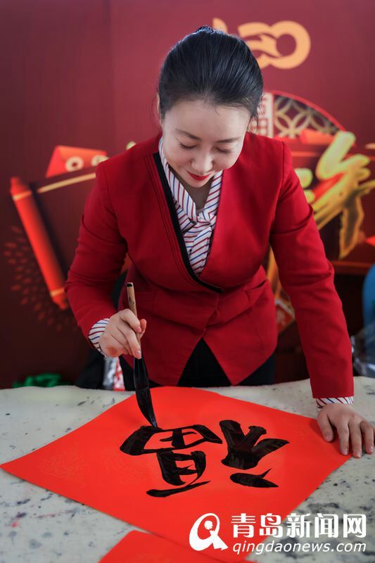 機(jī)場(chǎng)職工現(xiàn)場(chǎng)寫福字。(苗瑋攝)