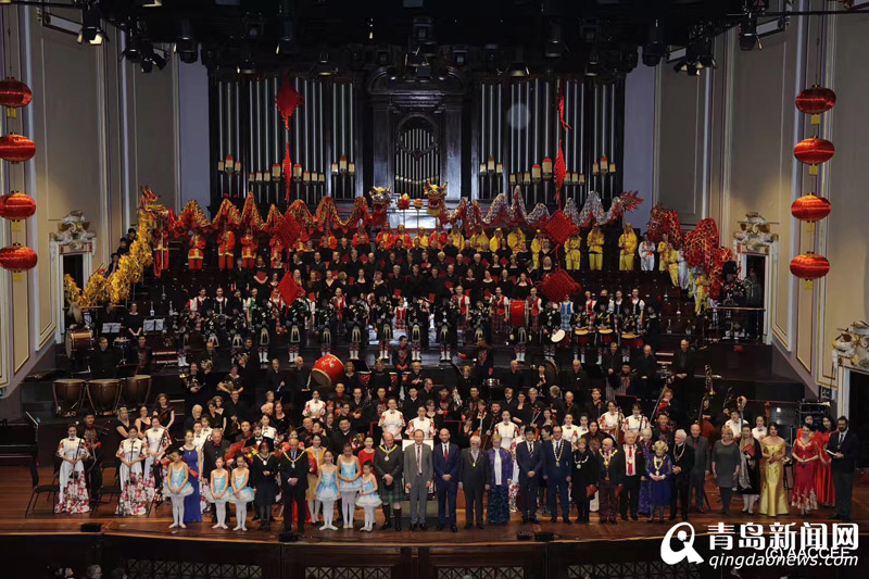 中國農歷大年初五,愛丁堡亞瑟廳被大紅燈籠點綴,這座1914年起開放的音樂廳,洋溢著歡樂吉祥的新春氛圍。音樂會開始前,中國駐愛丁堡總領事潘新春先生與愛丁堡市長弗蘭克·羅斯先生共同為中國龍點睛,寓意著新年的吉祥如意。今年的新春音樂會集結優秀的專業藝術團隊,演員人數約300人,陣容強大。青島市歌舞劇院民樂團作為特邀嘉賓,為蘇格蘭當地觀眾展示了中國民族樂器的魅力?!段业淖鎳?、《絲綢之路》用激昂澎湃的樂章,呈現祖國錦繡山河的壯闊;《慶典序曲》、《好日子》洋溢著新春佳節的喜慶和歡樂。其中不少曲目經過全新編曲,寓意深遠。青島市歌舞劇院民族樂團和愛丁堡交響樂團共同奏響《花好月圓》傳遞出團圓喜慶的美好愿望;愛丁堡合唱團用中文唱響《茉莉花》;創新編曲的蘇格蘭民族歌曲《友誼地久天長》集結民族樂團、交響樂團、合唱團以及風笛隊的默契演奏,在音樂會最后掀起了高潮,傳遞出兩國友誼長久美好發展的祝福。