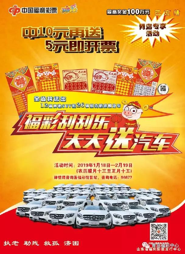 2019年1月18日—2月19日,在山東省內購買福彩刮刮樂“己亥豬”5元、10元、20元彩票任意品種,用手機掃描玩法區內的二維碼參與抽獎活動,就有機會獲得奔馳SUV或別克新威朗汽車。