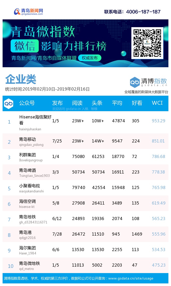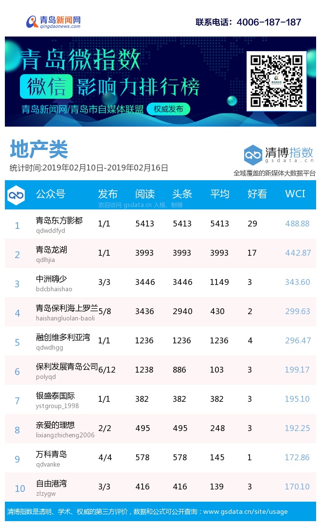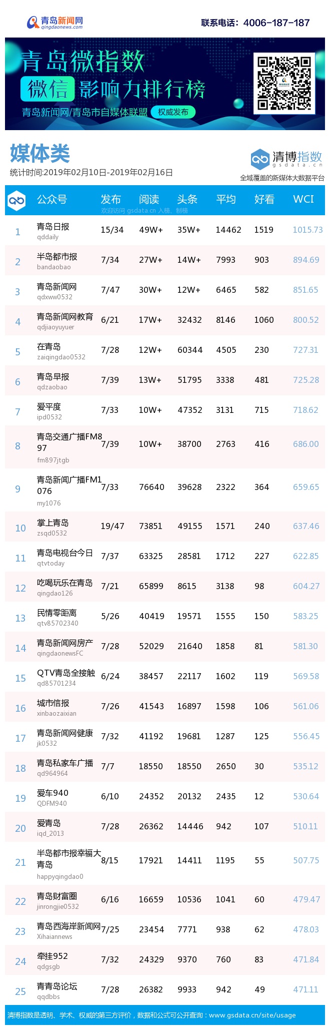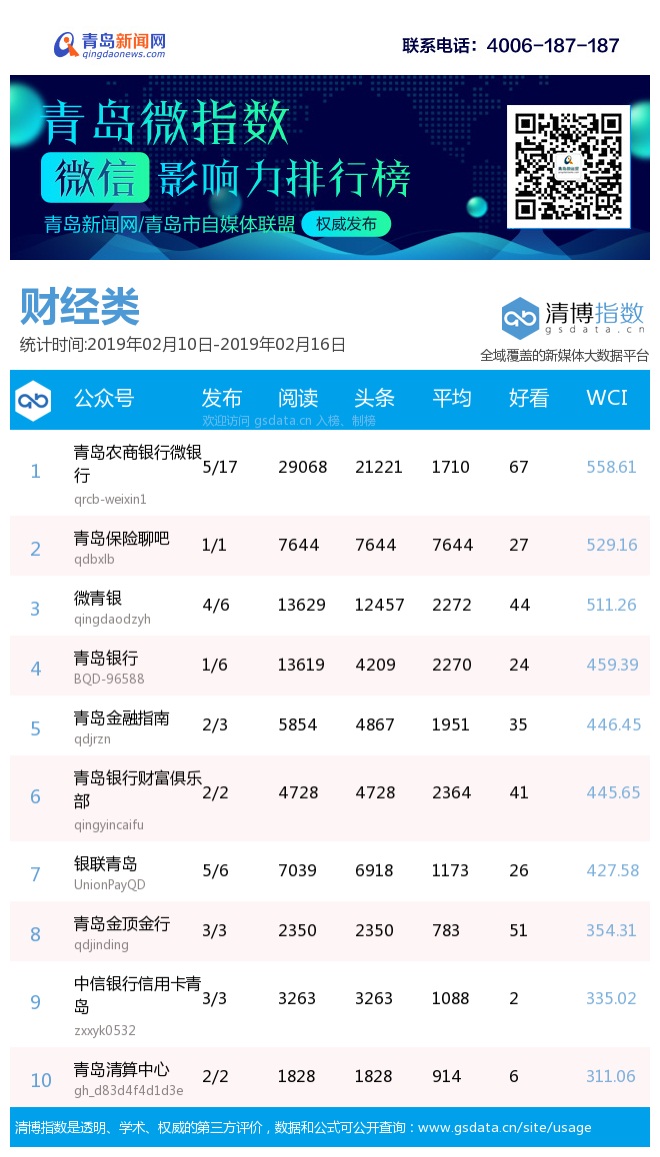 3、本次榜單收錄了青島14個行業(yè)微信公眾號,如您的賬號暫未收錄,可聯(lián)系4006-187-187。
