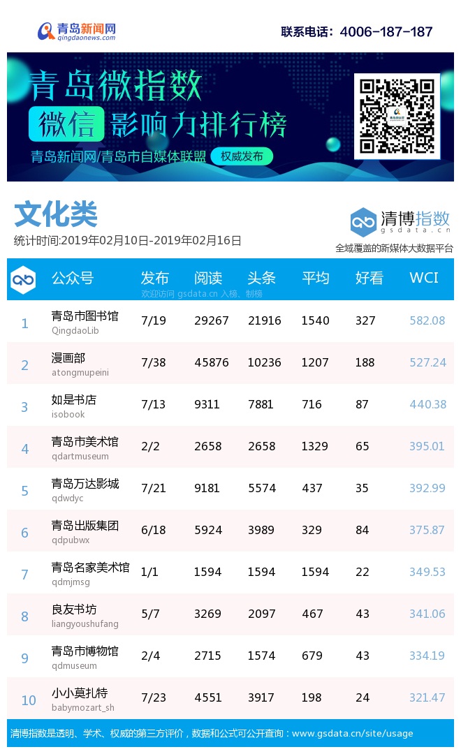 青島新聞網(wǎng)2月18日訊(記者 邢書玲)由青島新聞網(wǎng)、清博指數(shù)平臺聯(lián)手打造的“青島微指數(shù)微信影響力排行榜”今日發(fā)布一周(2月10日-2月16日)榜單。