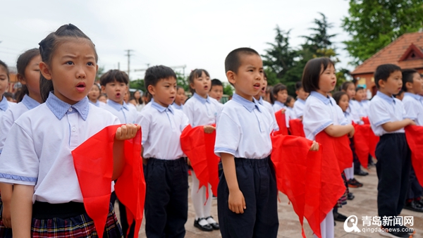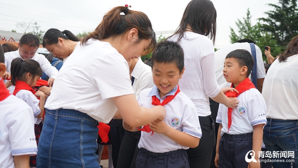 出旗、唱隊歌、宣讀新隊員名單,爸爸媽媽為新隊員佩戴紅領巾。隨后,新隊員們參觀了中共青島黨史紀念館,學習革命先烈,傳承紅色精神。