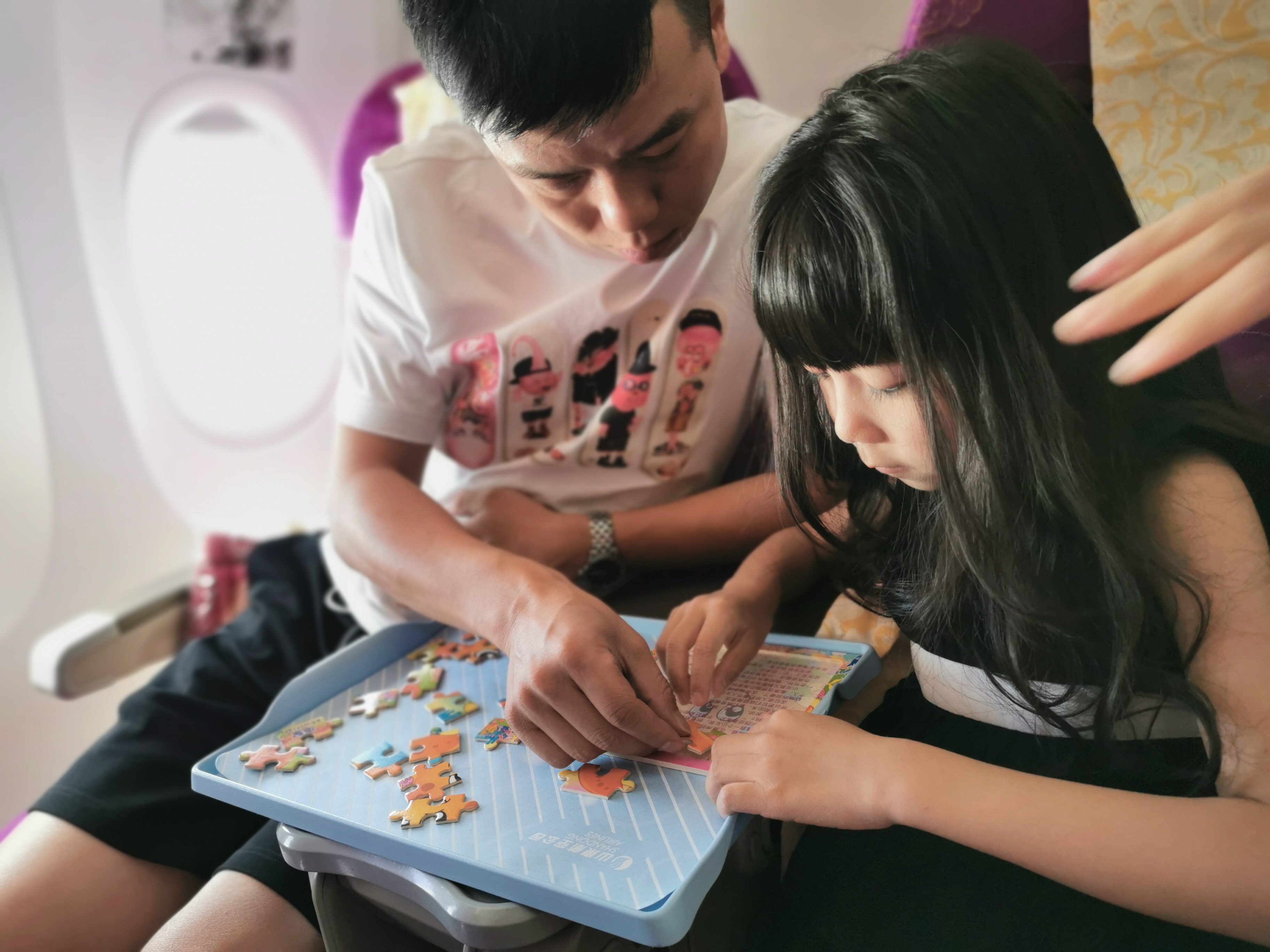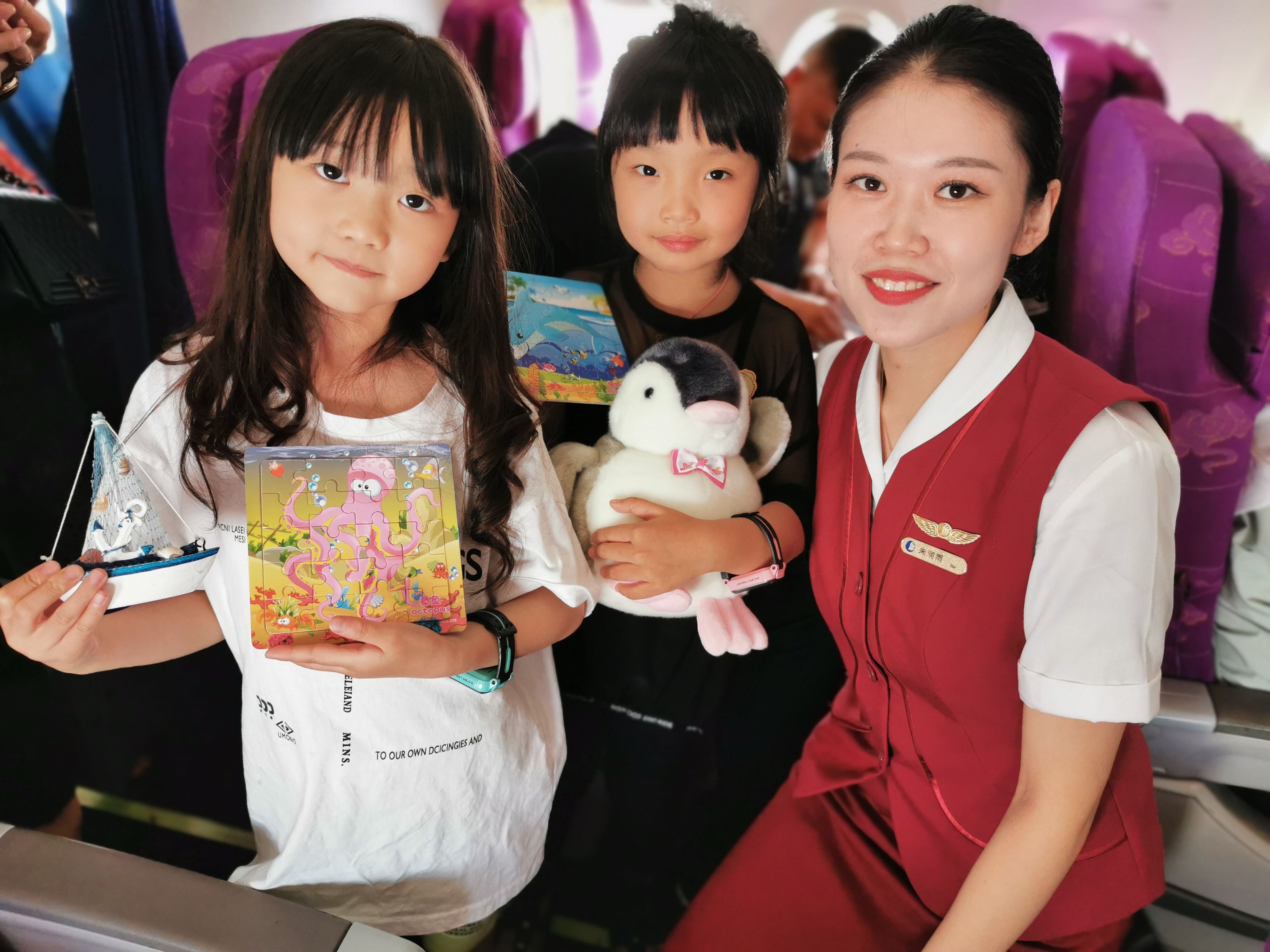 “今天是中國航海日,第一個游戲為海洋主題眼力手力大比拼!”乘務員邀請了六位乘客,并把他們分成兩組進行一對一海洋拼圖比賽。隨著乘務員一聲令下,比賽開始,時間一秒一秒的過去。“我拼完了!”一名乘客僅用時1分鐘就將拼圖拼完。獲得第一名的乘客收到了乘務員送上的山航飛機模型,其他人則獲得了小帆船禮品。接下來,進行了海洋知識問答,乘務員從踴躍參與的乘客中選出4人參與問答。“在海洋的各種污染物中,對海洋的破壞最嚴重、最普遍的是……”在乘客緊鎖眉頭的思考中,海洋知識問答活動結束。參與問答的乘客依次獲得了乘務員送出的海洋動物毛絨玩具。