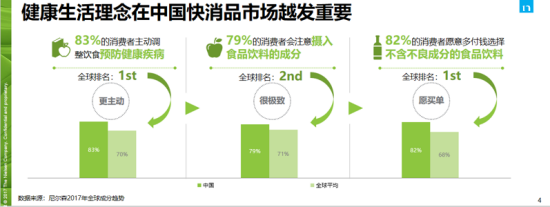 “收入水平的提升成為了驅使人們追逐品質生活的根源”。《報告》顯示,在消費理念上,健康生活的理念在中國快消飲料市場倍受推崇。與全球消費者相比,83%的中國消費者會主動調整飲食以預防健康疾病,高出全球平均13個百分點,他們對健康食品和飲料也更為重視,更有消費意愿。尼爾森數據顯示,79%的消費者會注意攝入食品和飲料的成分,82%的消費者愿意多付錢選擇安全成分的食品和飲料,而全球平均值僅為68%。