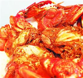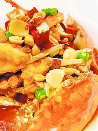 麻辣蟹:川菜風味 中航酒店廚師長張磊在成都進修交流,用川菜的辦法做海捕蟹,很受當?shù)厝讼矚g。他介紹,螃蟹用刷子刷干凈,揭開蟹殼,大斬八塊。蔥姜拍散。用淀粉把蟹肉處封住。