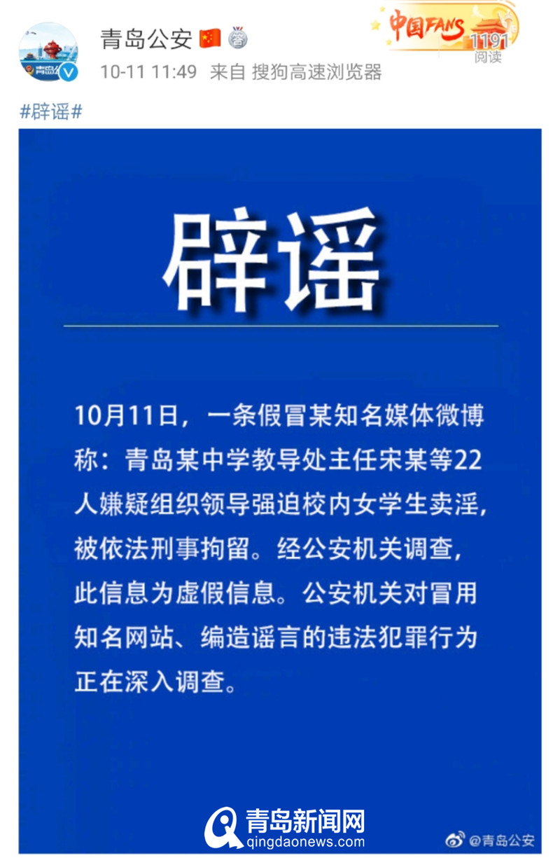青島新聞網(wǎng)10月11日訊(記者 丁淑華)10月11日,網(wǎng)傳某知名媒體微博截圖稱“青島某中學(xué)教導(dǎo)處主任宋某等22人嫌疑組織領(lǐng)導(dǎo)強(qiáng)迫校內(nèi)女學(xué)生賣淫,被依法拘留?!苯?jīng)公安機(jī)關(guān)調(diào)查,此信息為虛假信息。