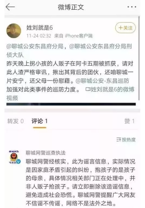 針對網友反映的問題,聊城網警回應表示,經調查核實,此為謠言信息,實際情況是因家庭矛盾引起的糾紛,抱孩子的是孩子的母親,具體情況相關部門正在處理中,并非人販子搶孩子。