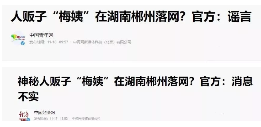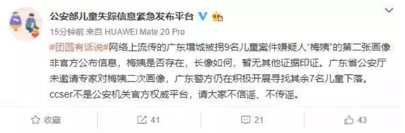 11月17日,人販子“梅姨”畫像被“官方”爆出,幾天之間朋友圈、微博熱搜各大V紛紛轉發。不久之后,公安部兒童失蹤信息緊急發布平臺官方微博發布辟謠消息: