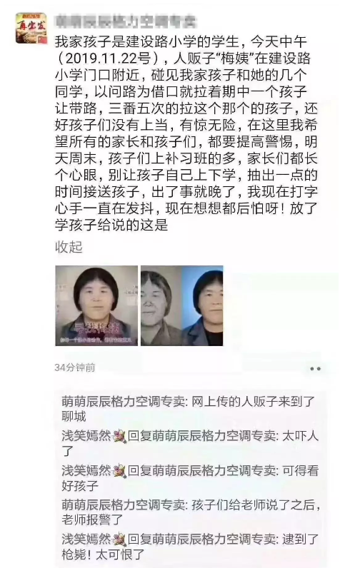 隨后,人販子“梅姨”來聊城的信息在更多聊城市民微信群、朋友圈傳播。