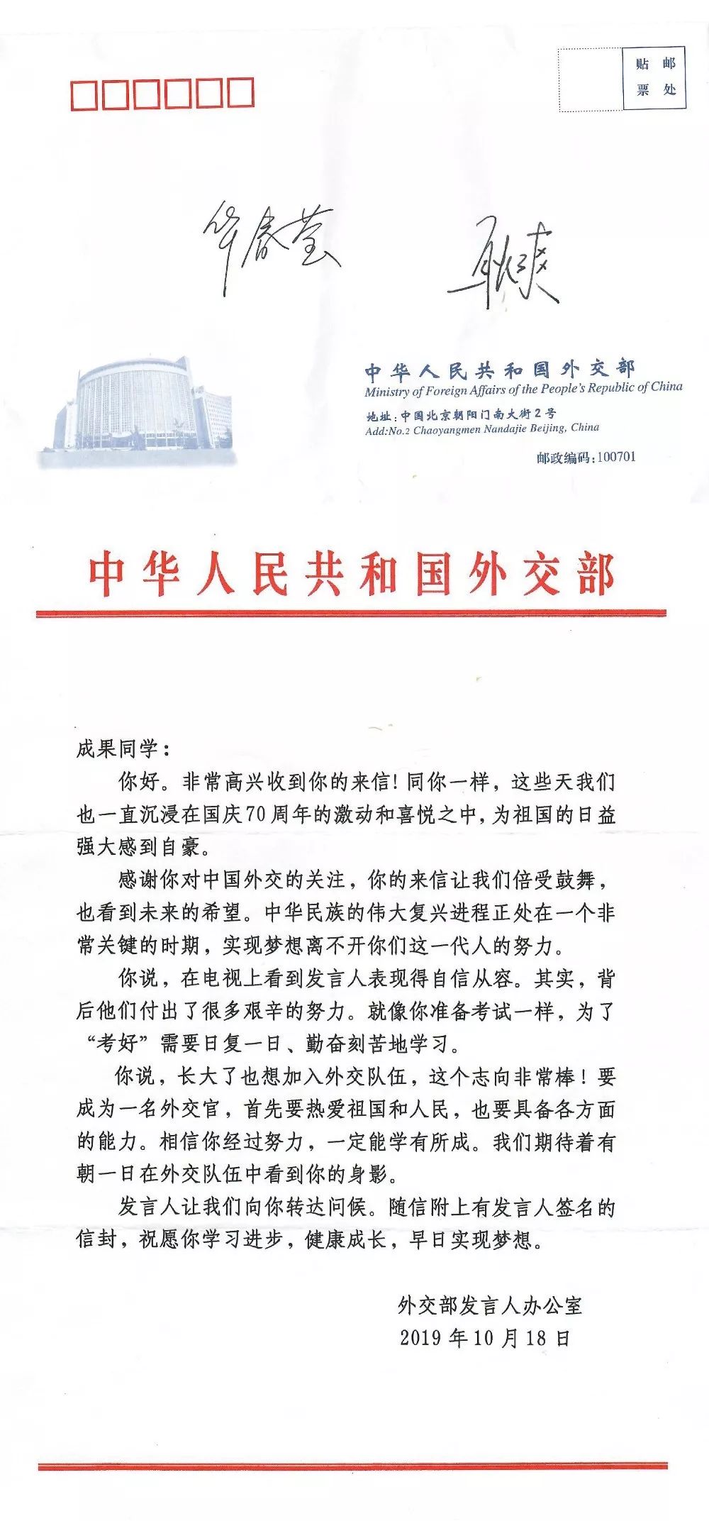 超銀小學推出的“家長職業生涯體驗”選修課幫助學生了解不同職業的工作內容,提升職業生涯規劃能力。二年級4班的成果深受這一課程和家庭教育的影響,從小樹立了與外交官工作相關的夢想。2019年國慶前夕,為了祝福祖國母親70周年華誕,成果抱著試試看的心態給外交部寫了一封信,沒想到很快就收到了回信,隨信還附上了我們耳熟能詳的外交部發言人華春瑩、耿爽的親筆簽名信封。“我覺得非常開心和自豪,我一定會像信里說的那樣,好好學習,健康成長,早日實現成為一名外交官的夢想!”成果興奮地說。