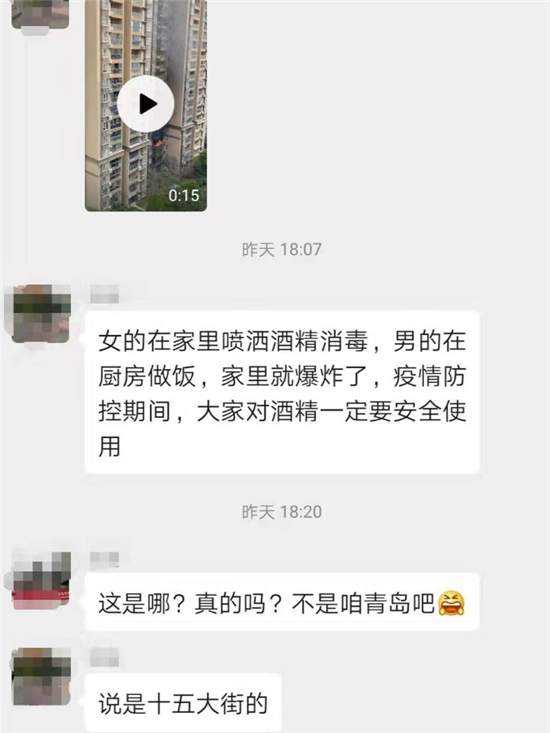 記者經過核實發現,在上海、武漢均發現了類似的傳言,而且傳言中的視頻,和青島的這段視頻一模一樣。這些傳言稱,是居民在家噴灑酒精消毒,遇到做飯的明火將房屋引燃。但是,上海、武漢等地消防部門均已第一時間辟謠。2月5日上午,記者聯系了青島市消防救援支隊后獲悉,青島市消防救援支隊近期并沒有到十五大街出過警,這一消息并不屬實。
