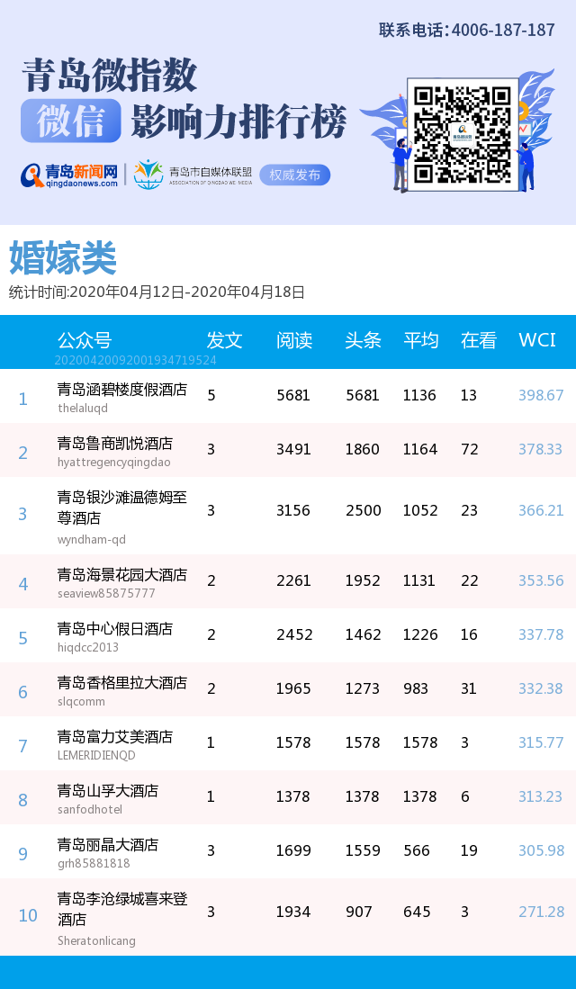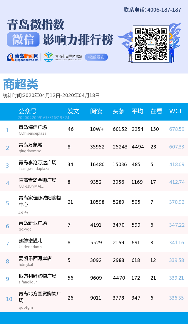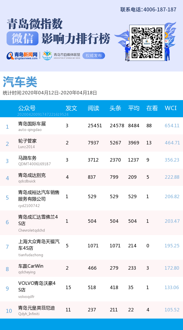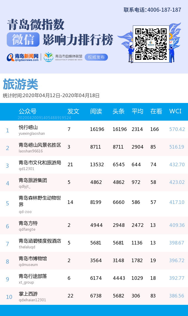 3、本次榜單收錄了青島14個行業(yè)微信公眾號,如您的賬號暫未收錄,可聯(lián)系4006-187-187。