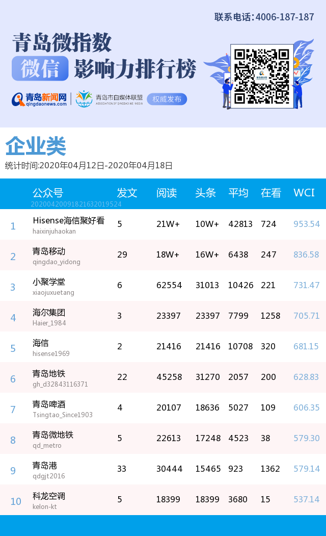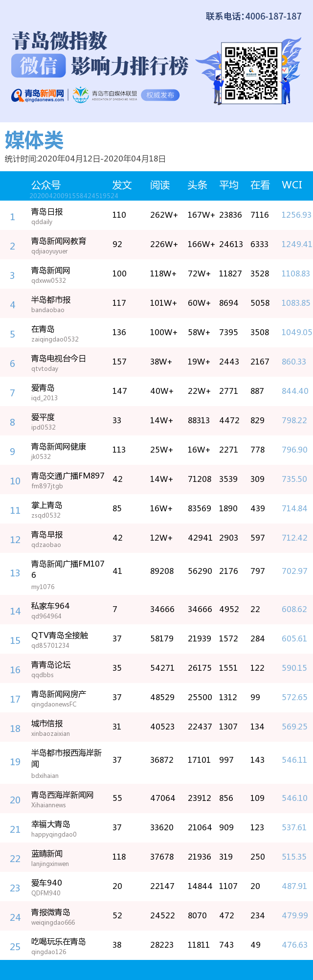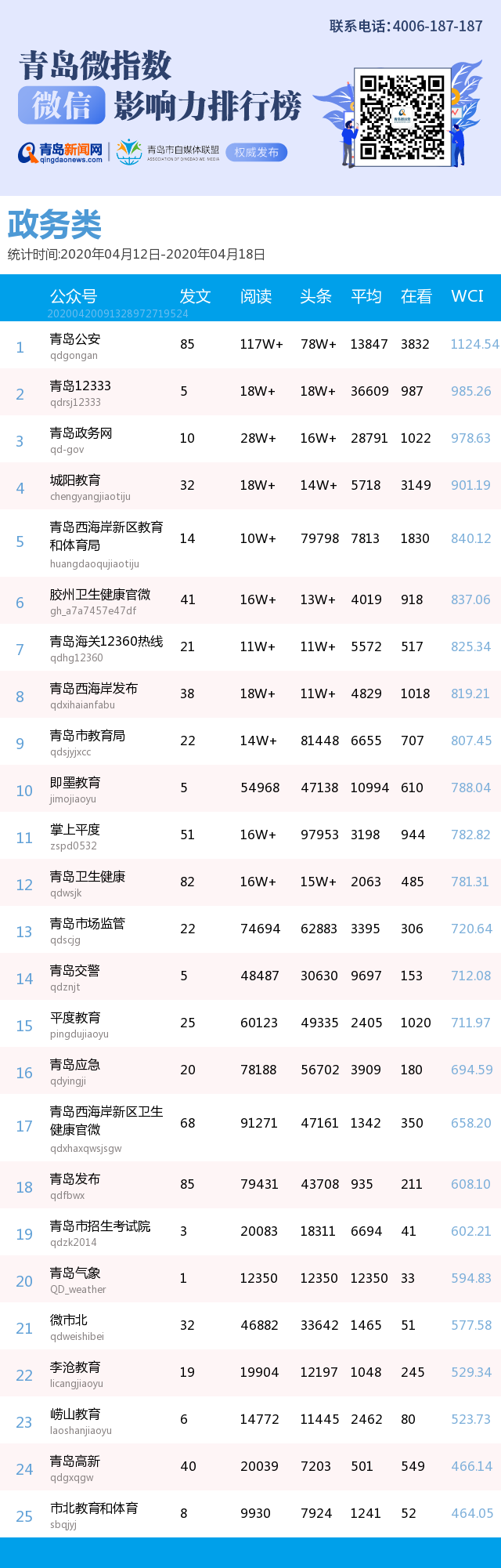 青島新聞網(wǎng)4月20日訊(記者 邢書玲)由青島新聞網(wǎng)打造的“青島微指數(shù)微信影響力排行榜”今日發(fā)布一周(2020年4月12日-2020年4月18日)榜單。