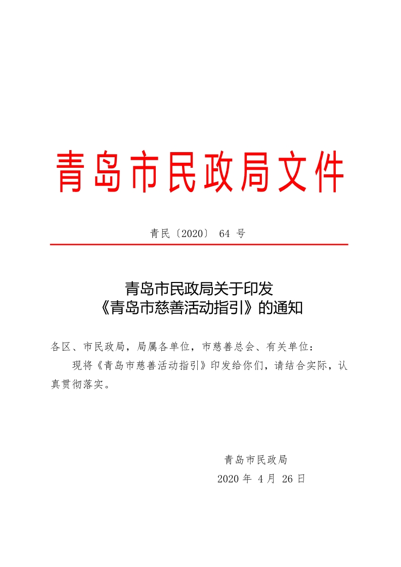 2020年4月26日,青島市民政局印發(fā)《青島市慈善活動指引》,這也是國內首個指導慈善活動實施的標準化文件。