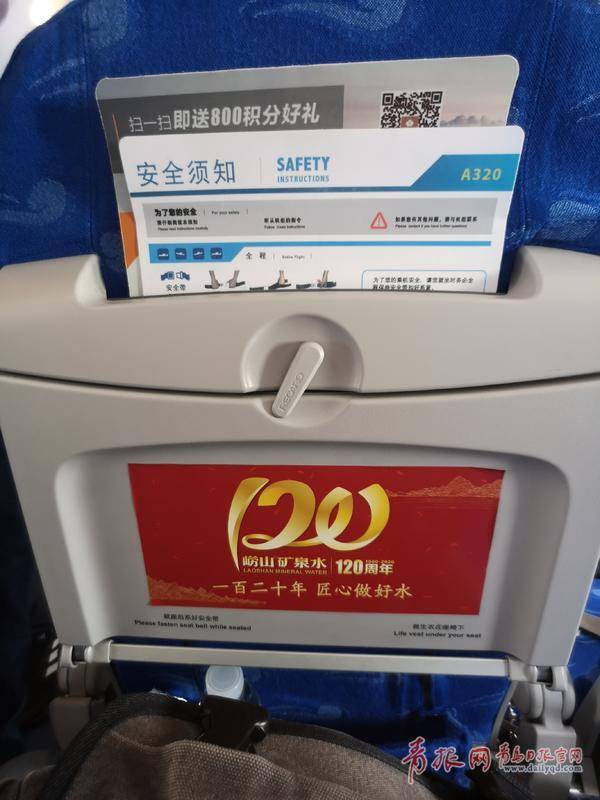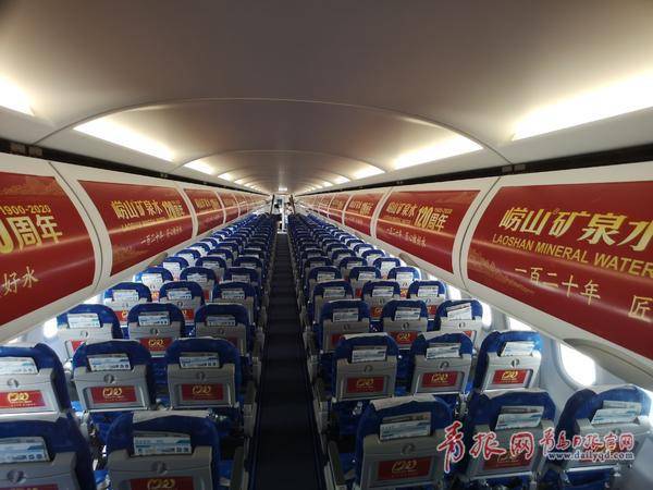 “您好,嶗山礦泉水!”剛一登機,乘務員就向登機人員發(fā)放了一瓶嶗山礦泉水。走進機艙,座位上方的近百個行李架蓋板上,大紅色的嶗山礦泉水120周年主題宣傳海報,很是吸人眼球。坐在座椅上,記者留意到,機艙內(nèi)174個座椅前方的小桌板上,同樣附有“濃縮版”主題宣傳海報。值得一提的是,乘務人員還貼心為每一位顧客準備了一本由青島飲料集團出品的《水的呵護》宣傳手冊……這架飛機內(nèi),從客艙內(nèi)部裝飾、到機載視頻播放,再到機上飲用水,處處充滿嶗山礦泉水元素。