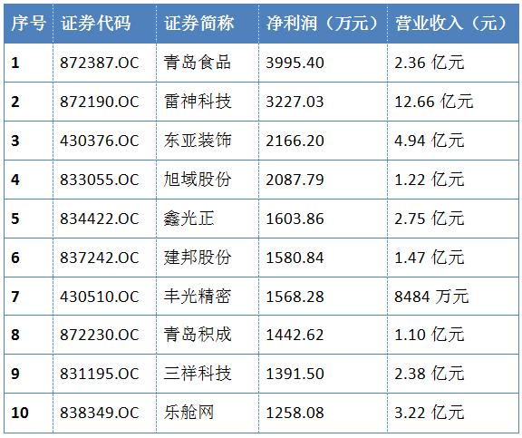 從凈利潤角度來看,排名前三位的企業是青島食品、雷神科技、東亞裝飾,凈利潤分別是3995.40萬元、3227.03萬元、2166.20萬元。
